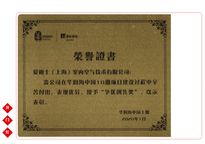 開門紅,法國愛迪士集團榮獲華潤海中國10期項目“爭優創先獎”,大連華潤海中國十期配備愛迪士RPM中央式高效除霾新風系統,共計576戶,已經全面開始交房并且交房期間0故障,0報修,0投訴!